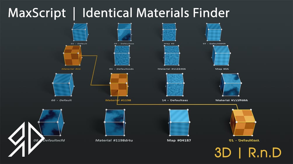 Installation : Run script or drag and drop to 3ds max, then go to customize user interface and assign "Identical Material Finder" as keyboard short-cut or quad menu under "3D_RnD" Category